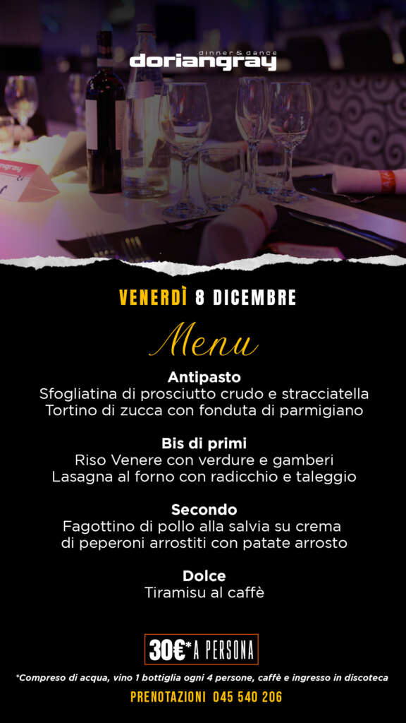 Delizia il tuo palato lasciandoti viziare dall’ineguagliabile e rinomata cucina dei nostri chef! Aperitivo, antipasto, bis di primi, secondo, contorno, dessert, acqua a volontà, 1 bottiglia di vino ogni 4 persone e caffè.
